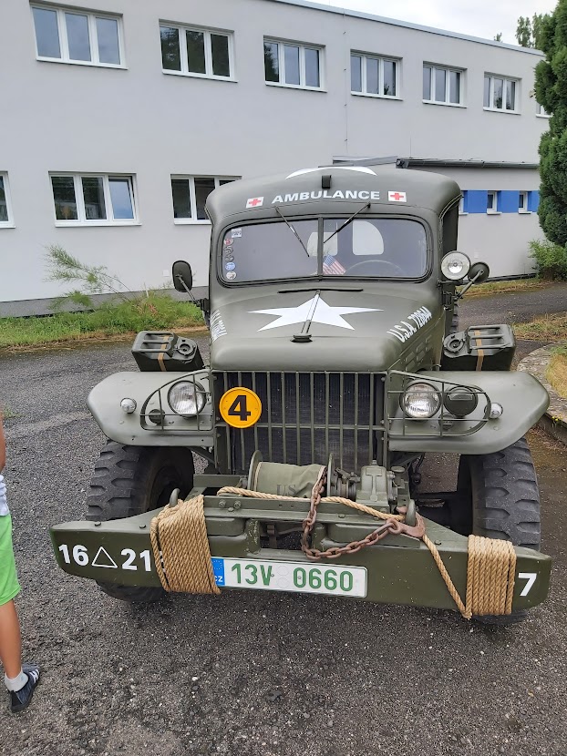 Fotografie | 22_23_5.B | Publikováno dne 18. 07. 2022 | PublikovalDlouho slibovaná a kvůli covidu odkládaná beseda s veteránskou sanitou Dodge z r.1943 se konečně uskutečnila. Děti se dozvěděly mnoho zajímavostí, potěžkaly si repliky historických zbraní a vyzkoušely si i polní zdravotnické lehátko.