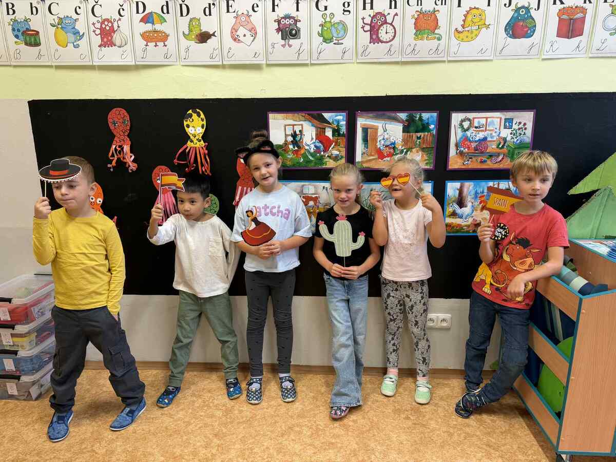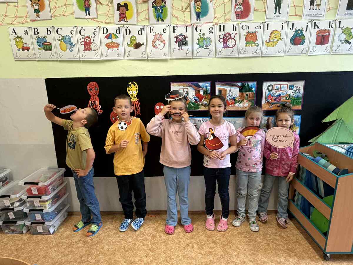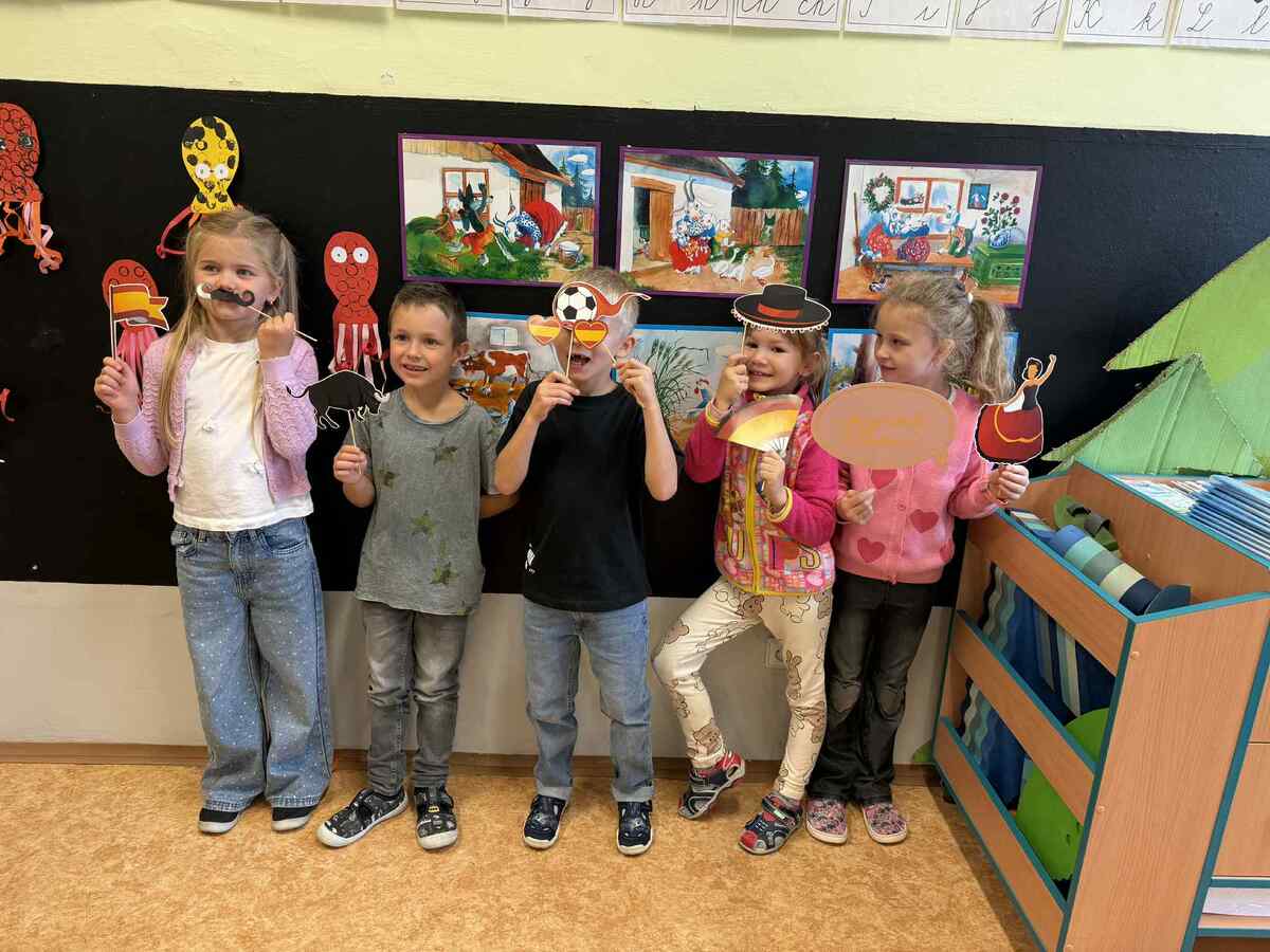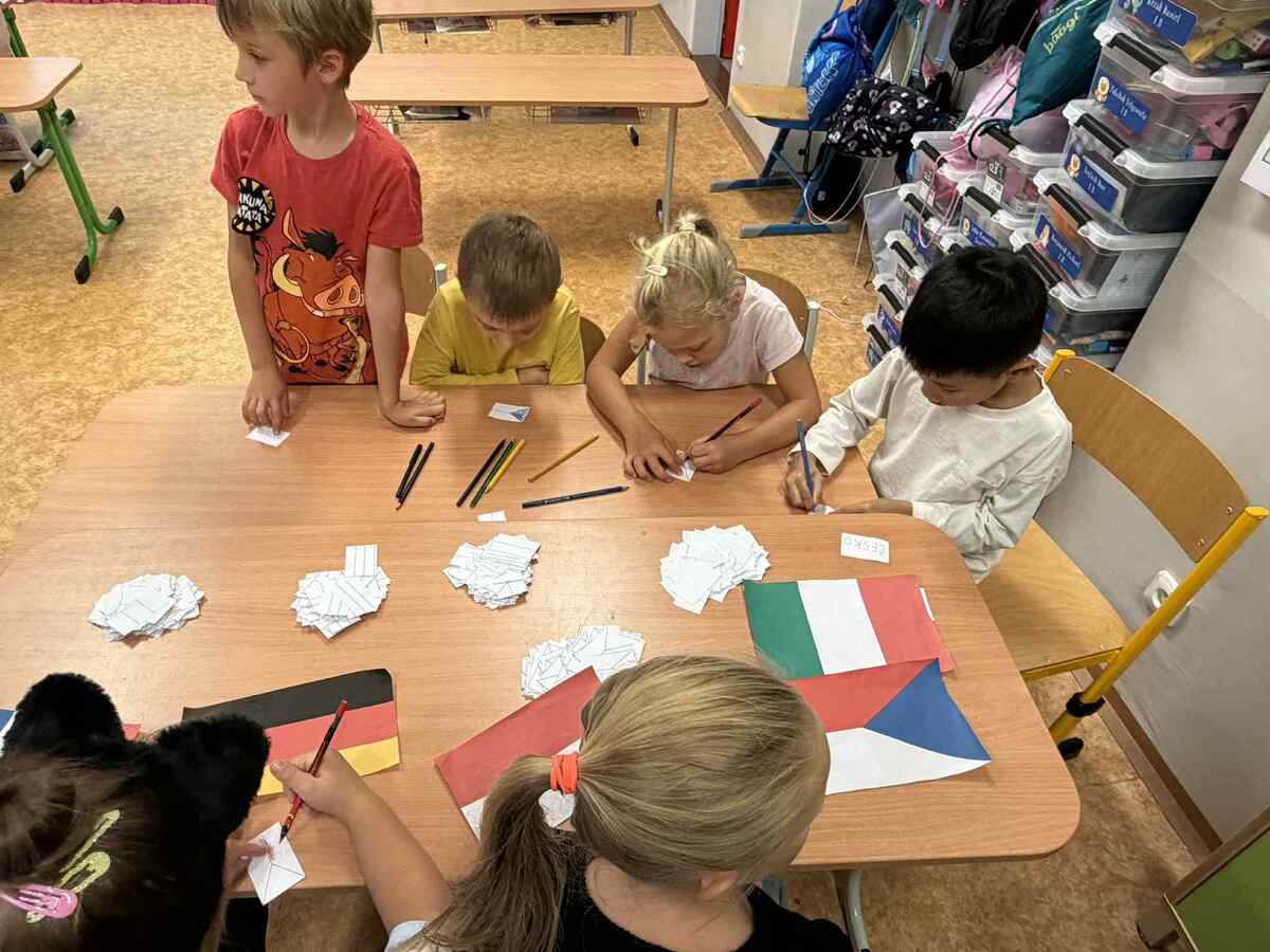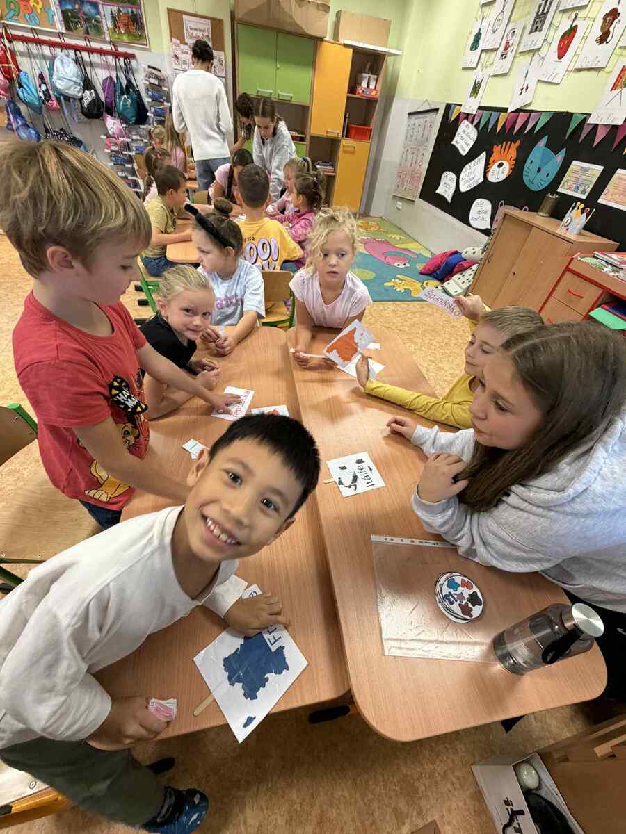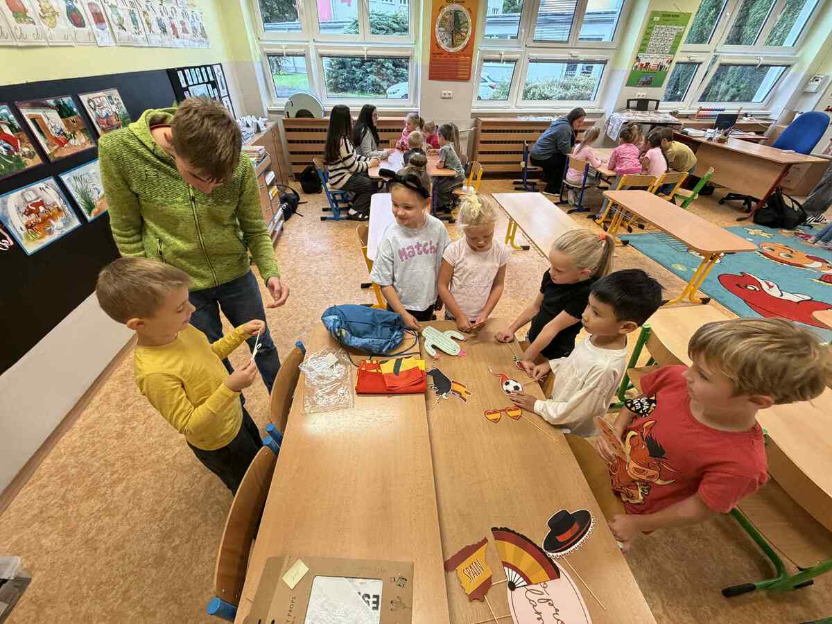 Fotografie | 1.C | Publikováno dne 26. 09. 2025 | Publikoval Mgr. Veronika GoldenDnešní dopoledne bylo jiné než obvykle. V rámci Evropského dne jazyků si žáci prošli 12 zábavných stanovišť, která pro ně připravili deváťáci. Společně skládali puzzle evropských vlajek, hráli animal kvíz, poznávali barvy v cizích jazycích, učili se německá slovíčka nebo se fotili ve španělském fotokoutku.