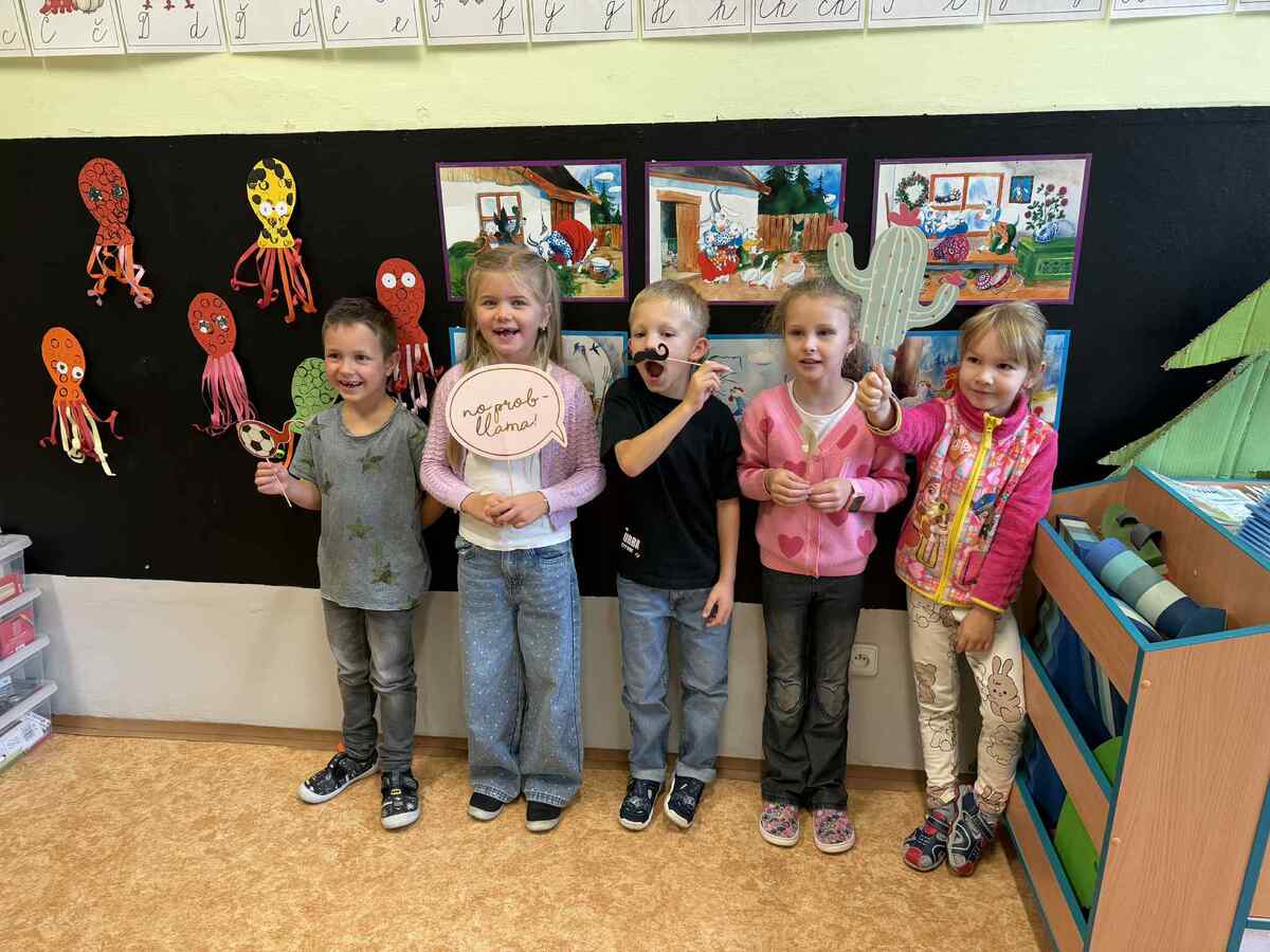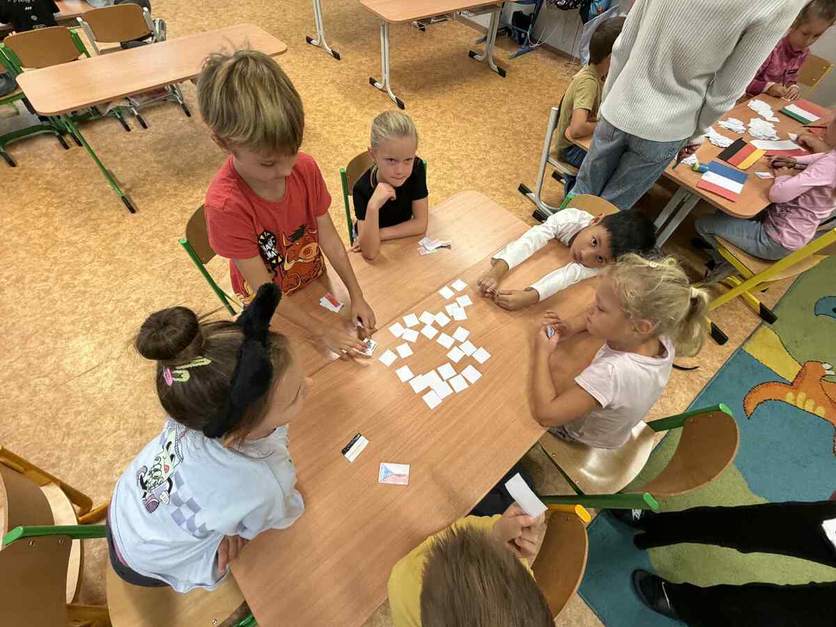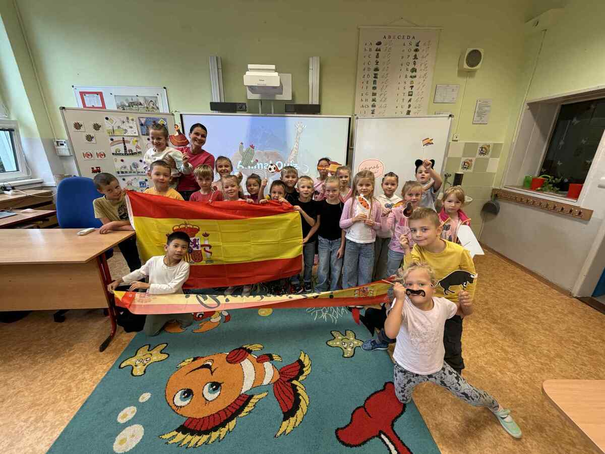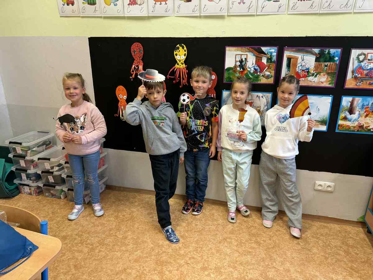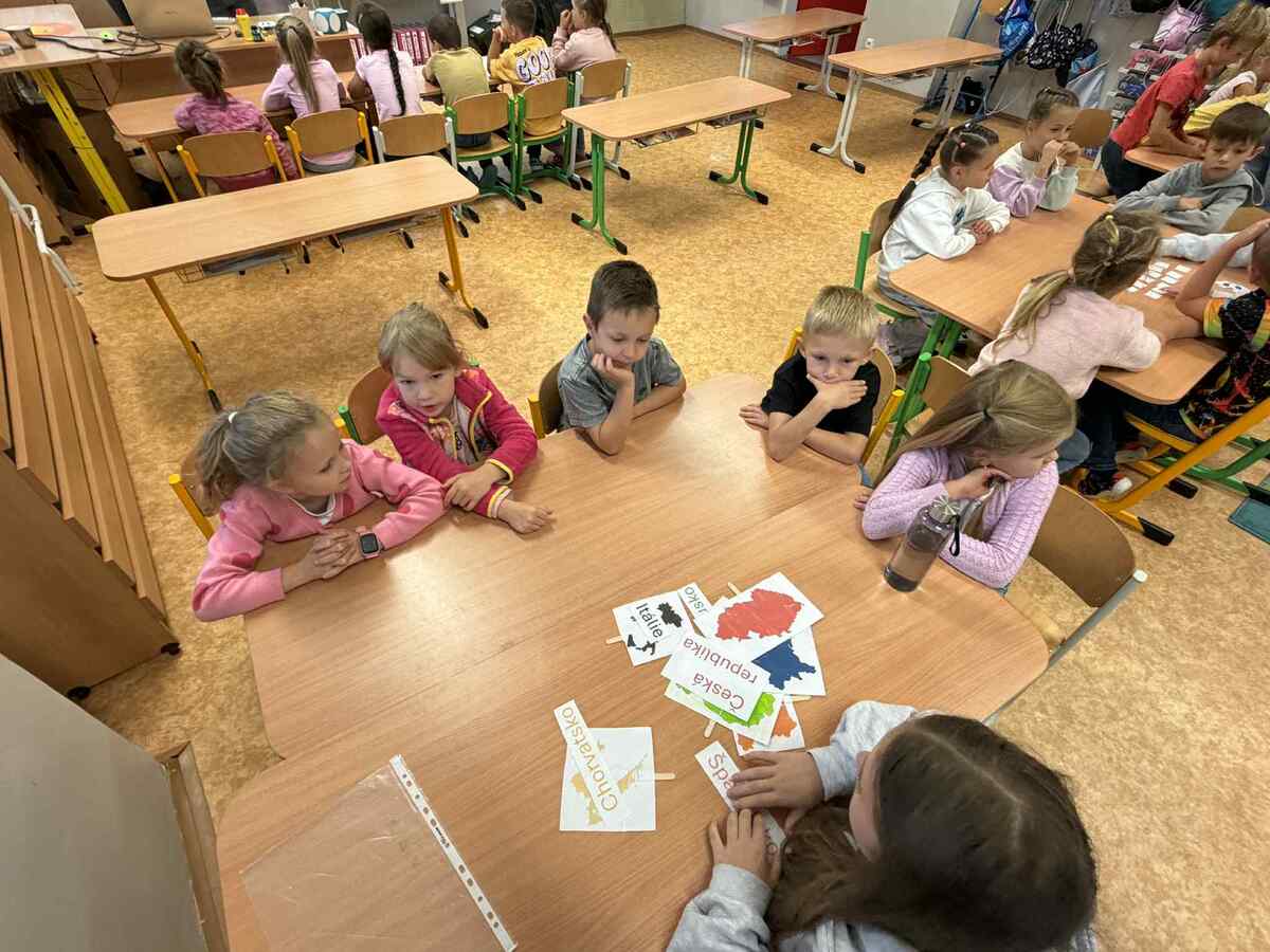 Fotografie | 1.C | Publikováno dne 26. 09. 2025 | Publikoval Mgr. Veronika GoldenDnešní dopoledne bylo jiné než obvykle. V rámci Evropského dne jazyků si žáci prošli 12 zábavných stanovišť, která pro ně připravili deváťáci. Společně skládali puzzle evropských vlajek, hráli animal kvíz, poznávali barvy v cizích jazycích, učili se německá slovíčka nebo se fotili ve španělském fotokoutku.