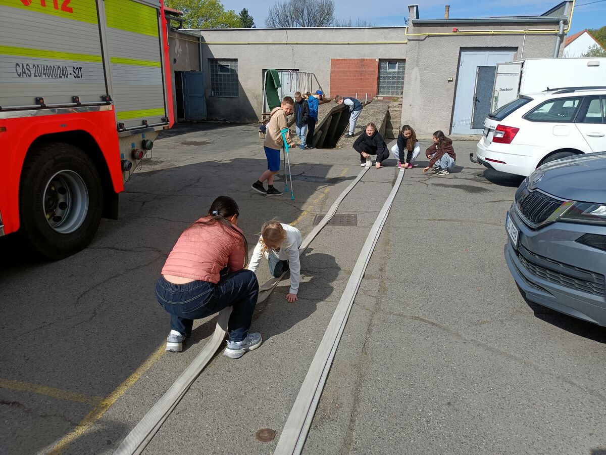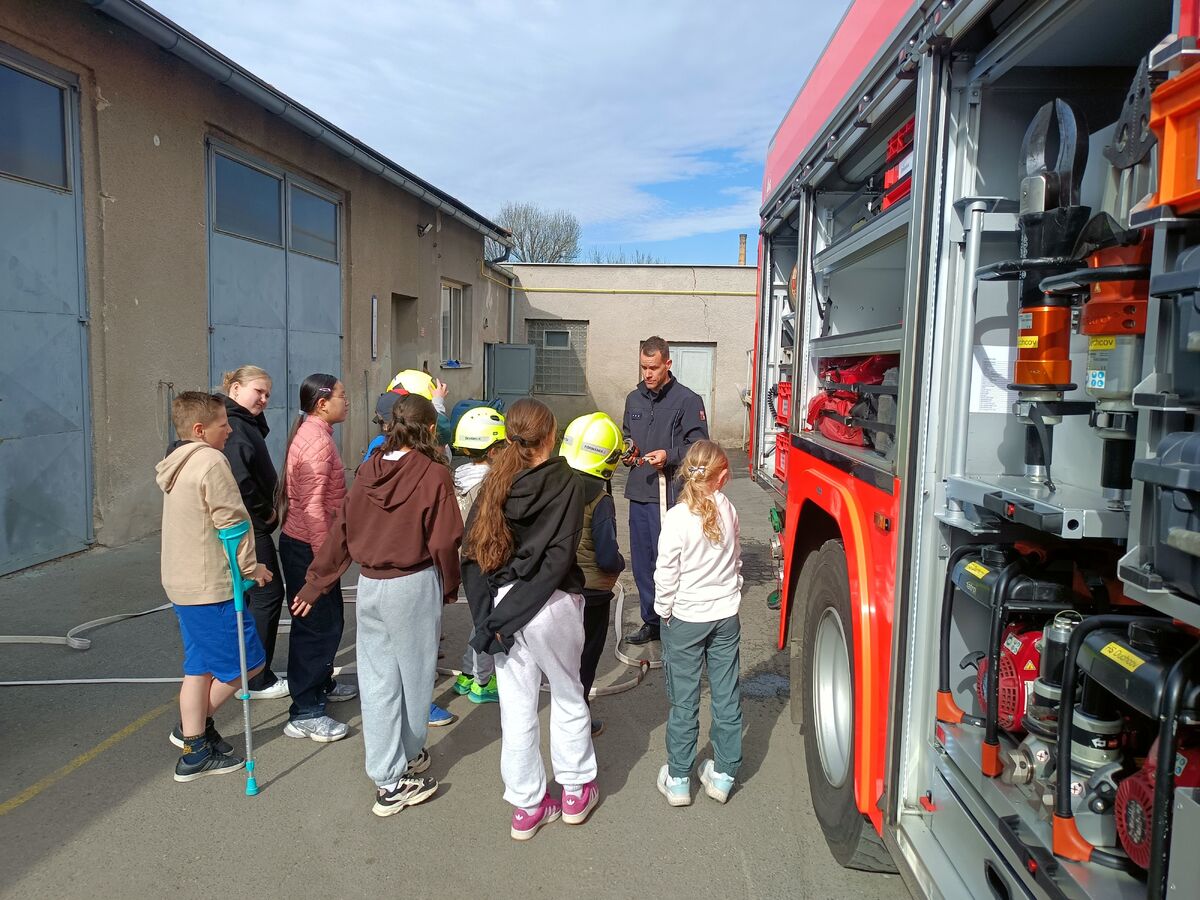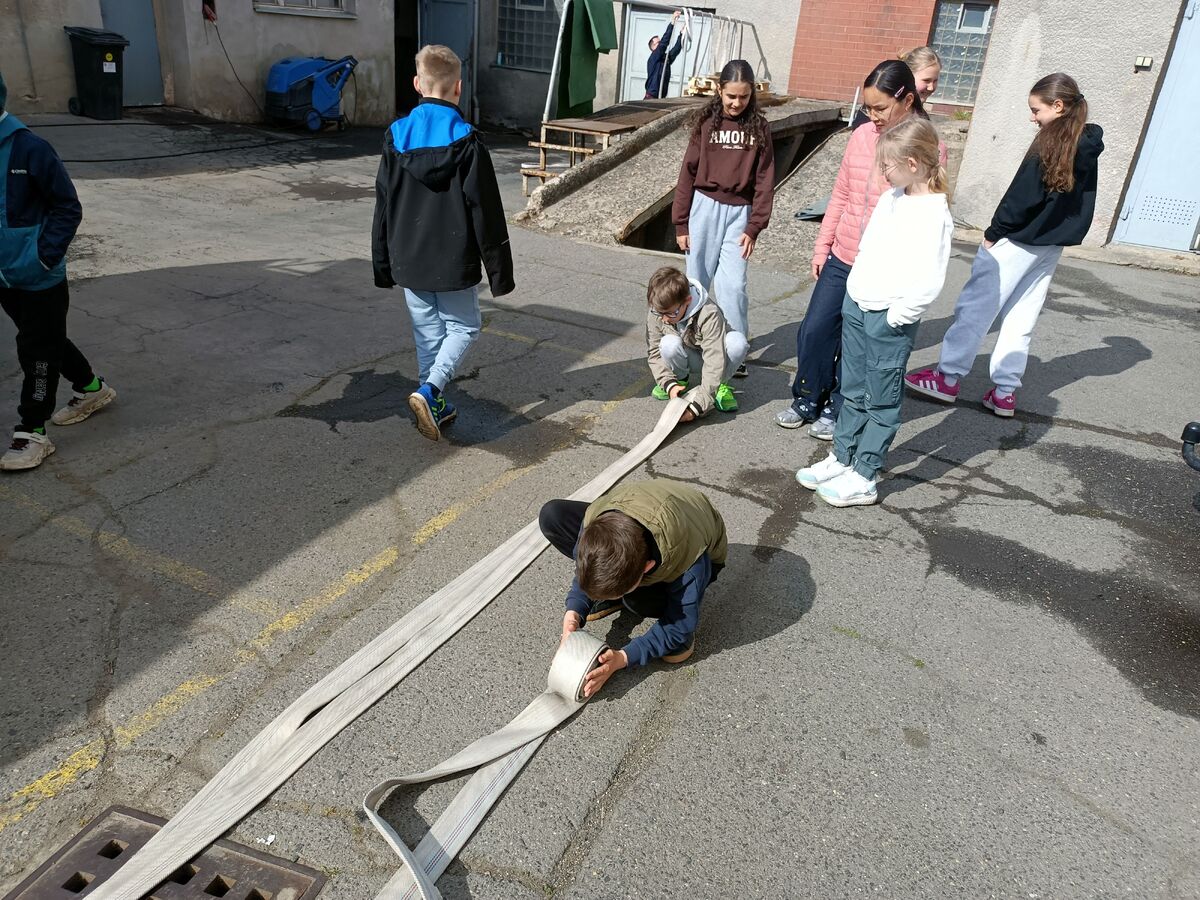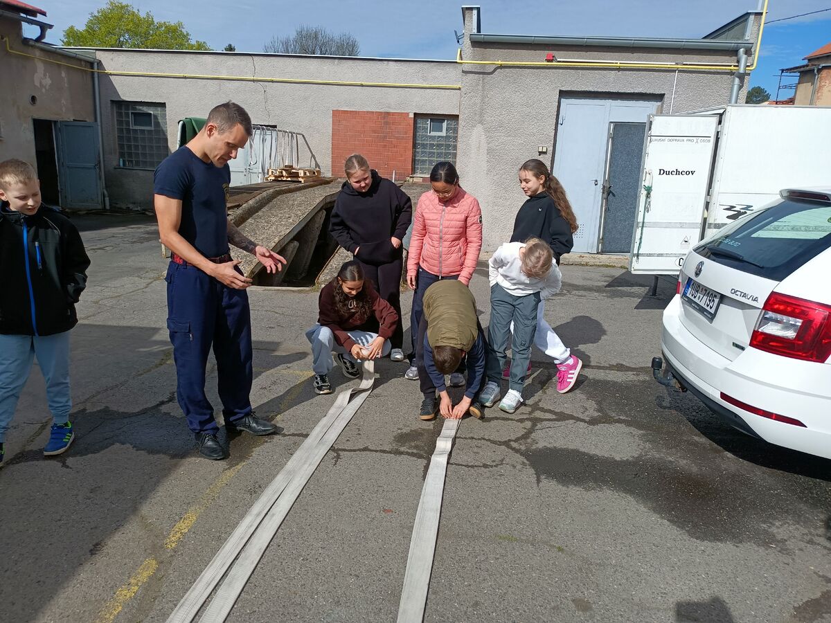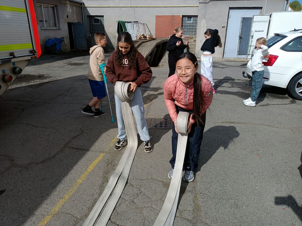 Fotografie | 4.A | Publikováno dne 26. 04. 2026 | Publikoval Mgr. Venuše AntoniszynováVe čtvrtek 23. dubna jsme se vypravili na exkurzi do Hasičské zbrojnice v Duchově. Kromě hasičského auta, hydraulických nůžek a dalších nezbytně nutných pomůcek jsme si vyzkoušeli nejen smotat hadice, ale také uhasit ,,požár”. Návštěva se nám moc líbila a dozvěděli jsme se mnoho zajímavých věcí.
