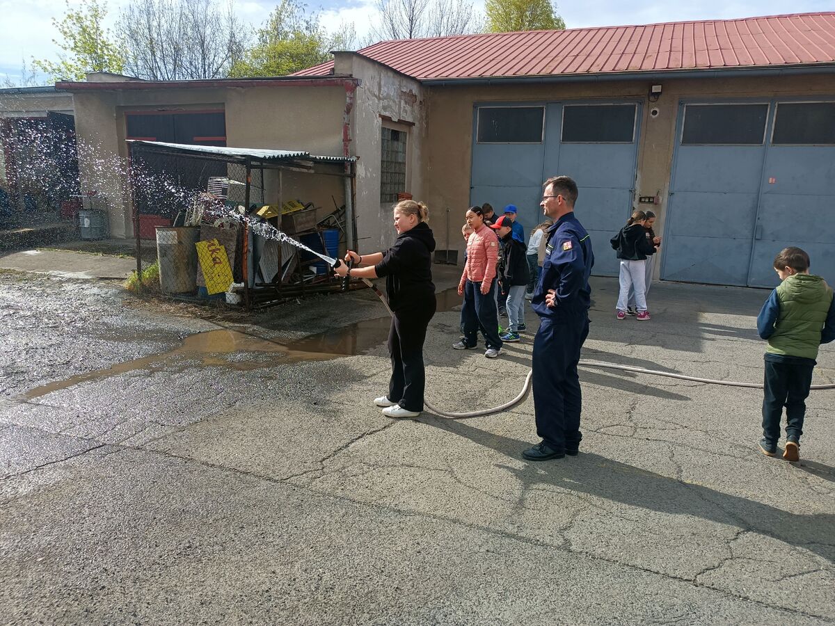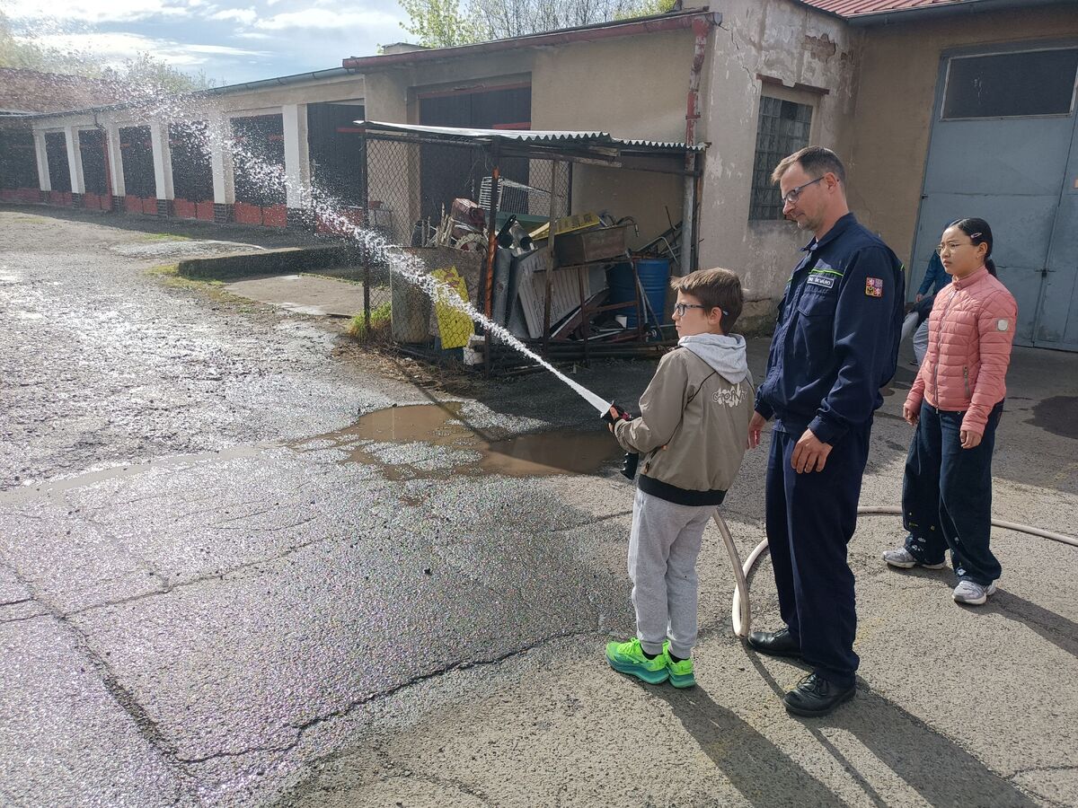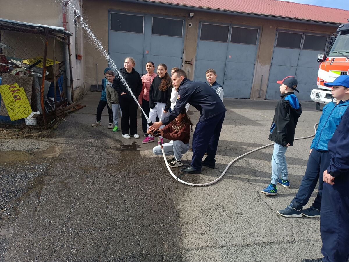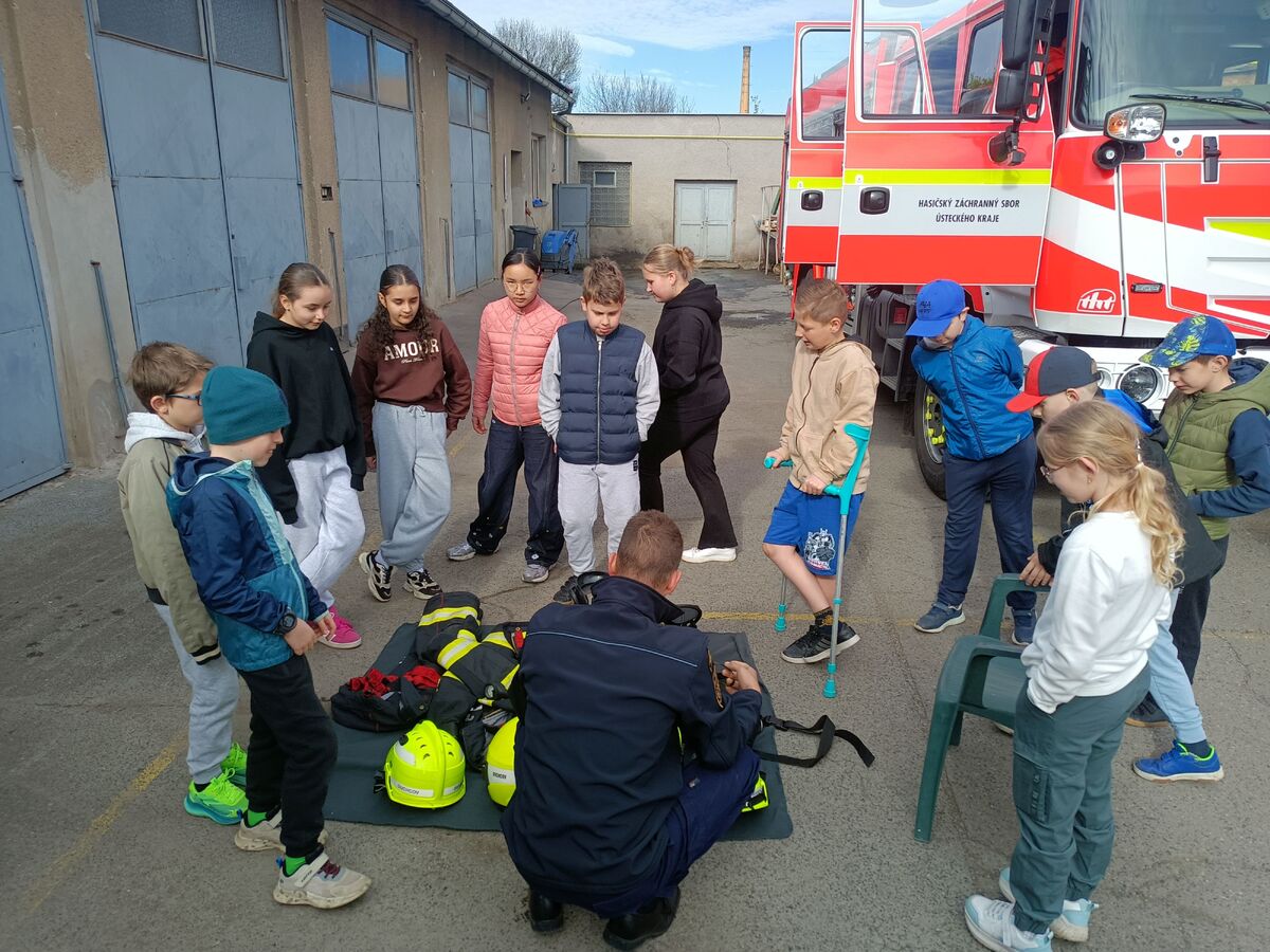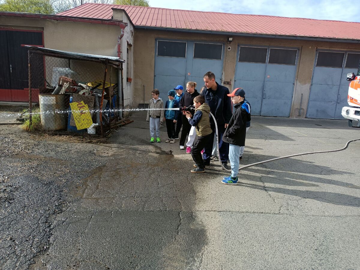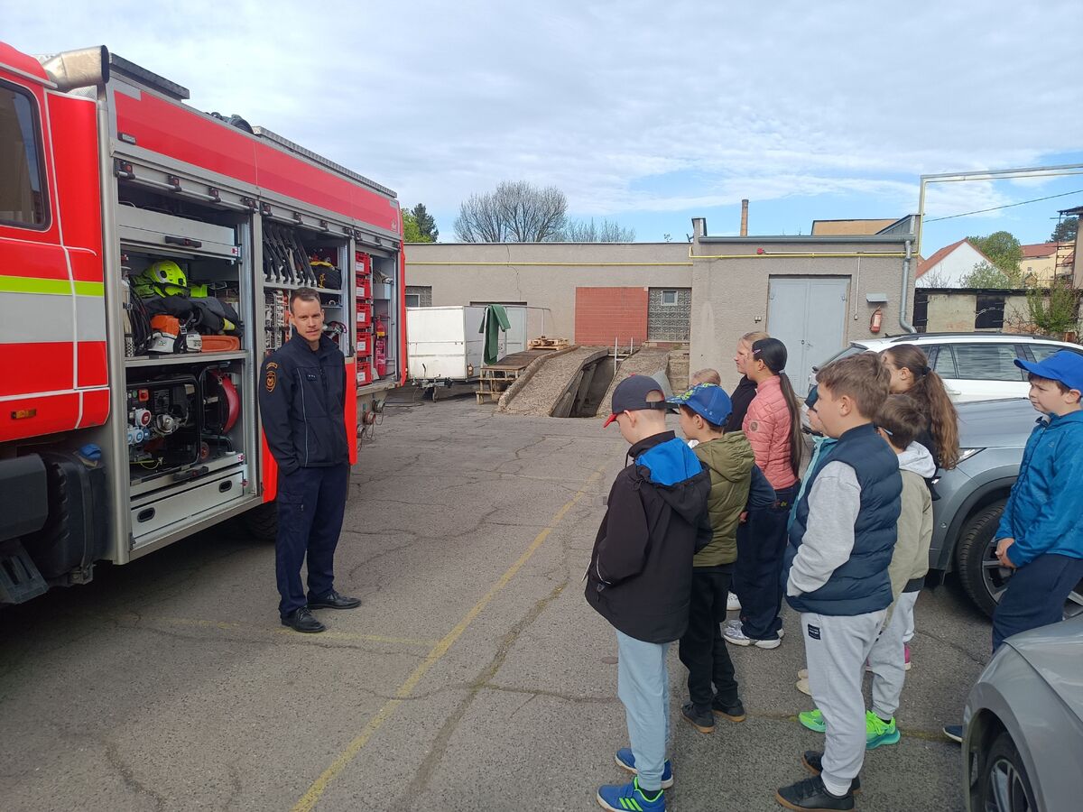 Fotografie | 4.A | Publikováno dne 26. 04. 2026 | Publikoval Mgr. Venuše AntoniszynováVe čtvrtek 23. dubna jsme se vypravili na exkurzi do Hasičské zbrojnice v Duchově. Kromě hasičského auta, hydraulických nůžek a dalších nezbytně nutných pomůcek jsme si vyzkoušeli nejen smotat hadice, ale také uhasit ,,požár”. Návštěva se nám moc líbila a dozvěděli jsme se mnoho zajímavých věcí.