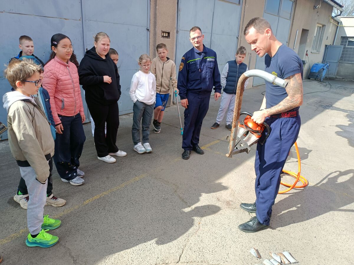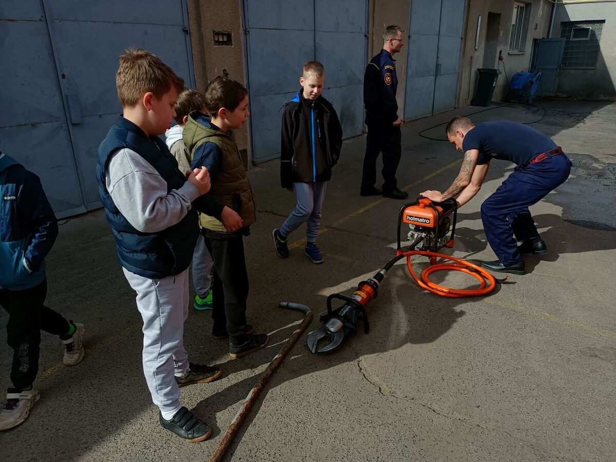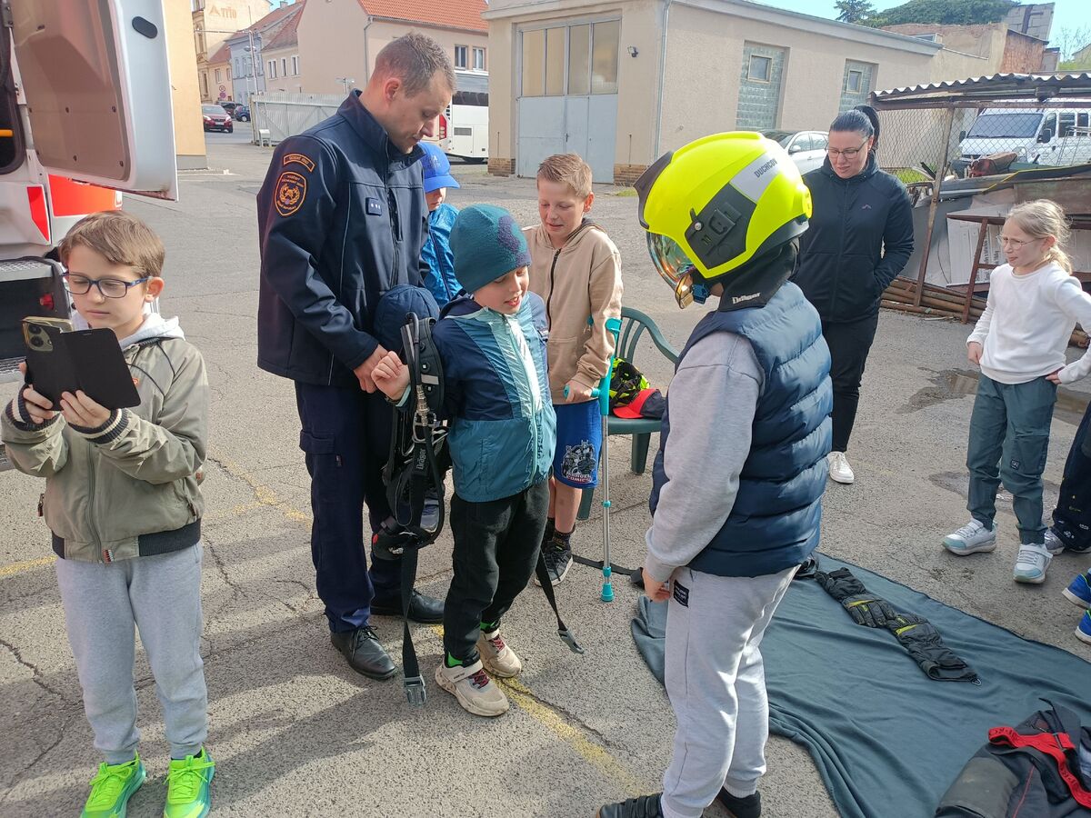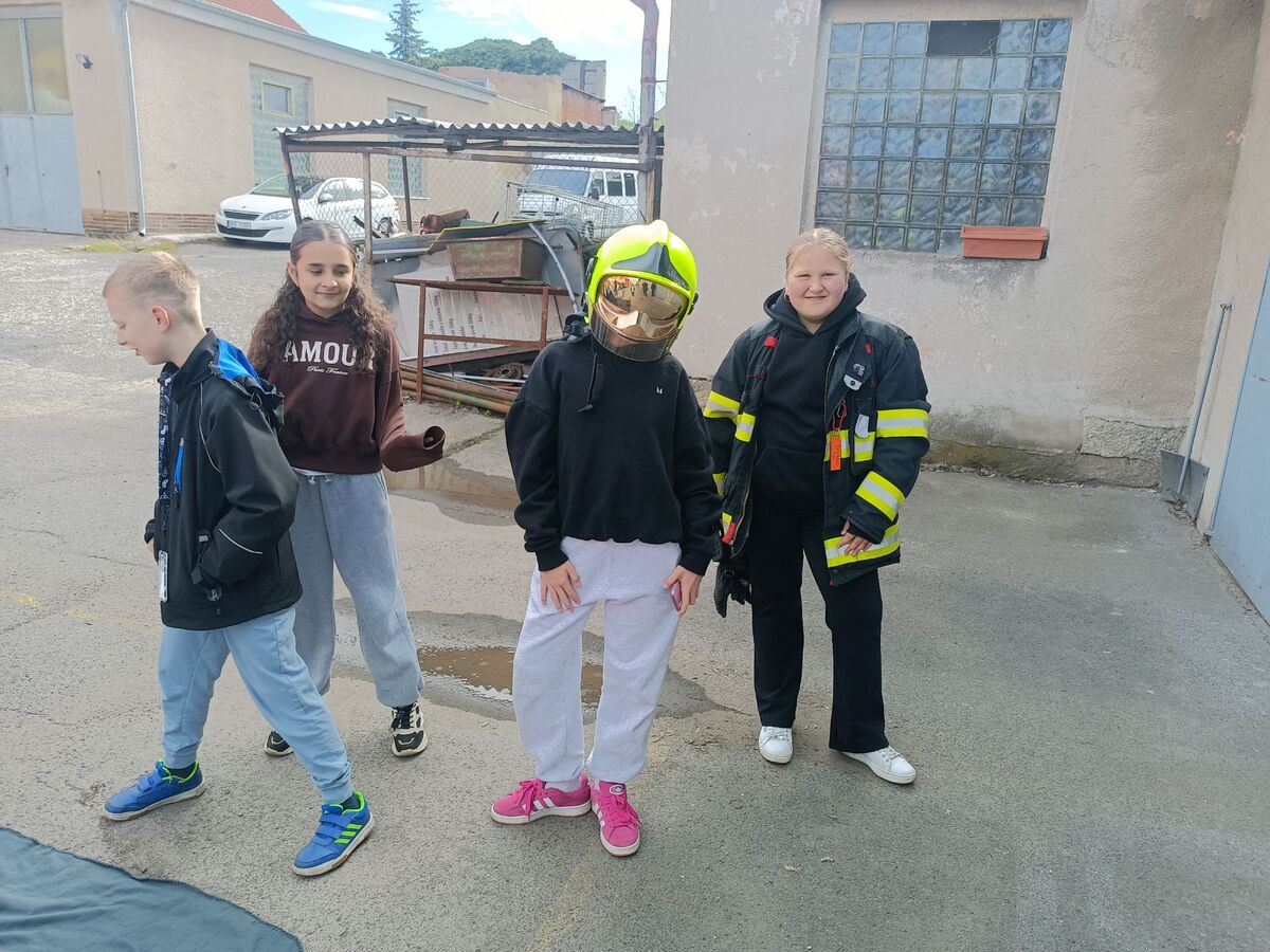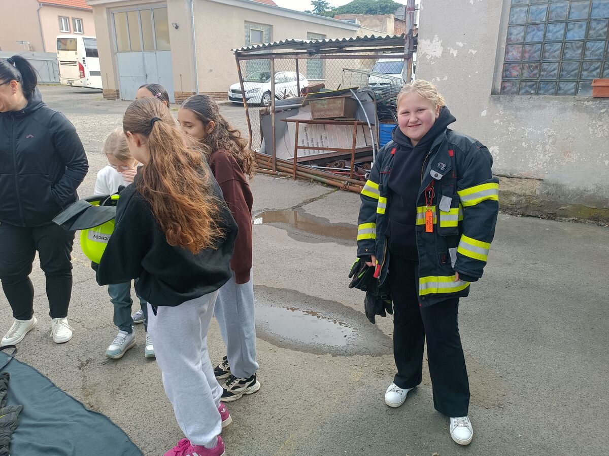 Fotografie | 4.A | Publikováno dne 26. 04. 2026 | Publikoval Mgr. Venuše AntoniszynováVe čtvrtek 23. dubna jsme se vypravili na exkurzi do Hasičské zbrojnice v Duchově. Kromě hasičského auta, hydraulických nůžek a dalších nezbytně nutných pomůcek jsme si vyzkoušeli nejen smotat hadice, ale také uhasit ,,požár”. Návštěva se nám moc líbila a dozvěděli jsme se mnoho zajímavých věcí.