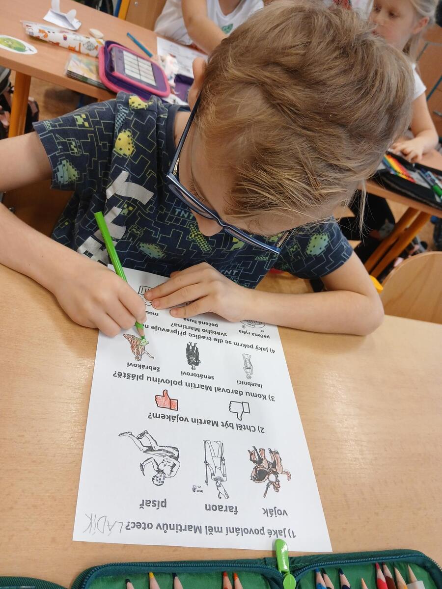 Fotografie | 2.A | Publikováno dne 17. 11. 2024 | Publikoval Mgr. Klára Stehlíková11. listopadu jsme také u nás ve třídě přivítali svatého Martina. Přečetli jsme si legendu o sv. Martinovi, pro snazší porozumění doplněnou ilustracemi. Společně jsme doplnili pracovní list s otázkami k příběhu, ve kterém děti vybarvovaly obrázky se správnou odpovědí. Na závěr děti k příběhu o sv. Martinovi malovaly své vlastní ilustrace.