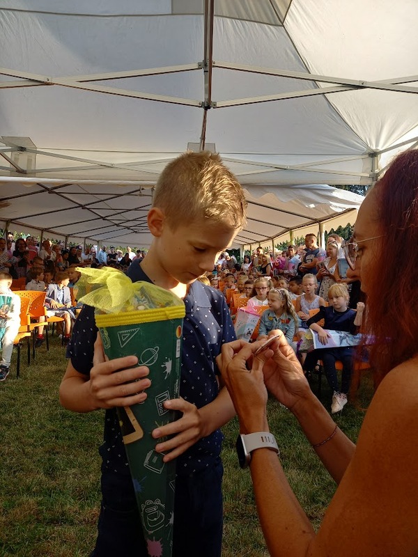 S prvňáky a jejich doprovodem jsme se v 8 hodin setkali v areálu školní zahrady. Tam totiž již několikátým rokem vítáme nové žáčky. Paní učitelky třídní: Stehlíková, Hrdinová, Bartoňová, zástupkyně pro 1. a 2. třídy paní Janovská, pan ředitel Kopřiva slavnostně přivítali nové osazenstvo 7. pavilonu. Každý z prvňáčků obdržel placku a hlavně dáreček (pomůcky, které se prvňáčkovi jistě hodí), který převzali z rukou náměstka primátora a senátora pana Hanzy. Všichni popřáli dětem úspěšný start do nové životní etapy. Průvodní slovo a hudební doprovod plný dětských písniček měl na starosti náš hudebník pan učitel Houdek. Na závěr si třídní odvedly své nové svěřence do jednotlivých tříd, aby si děti převzaly dárečky, pomůcky, zhodnotily výzdobu, vyzkoušely si lavice, a hlavně okoukly zblízka své spolužačky a spolužáky.
