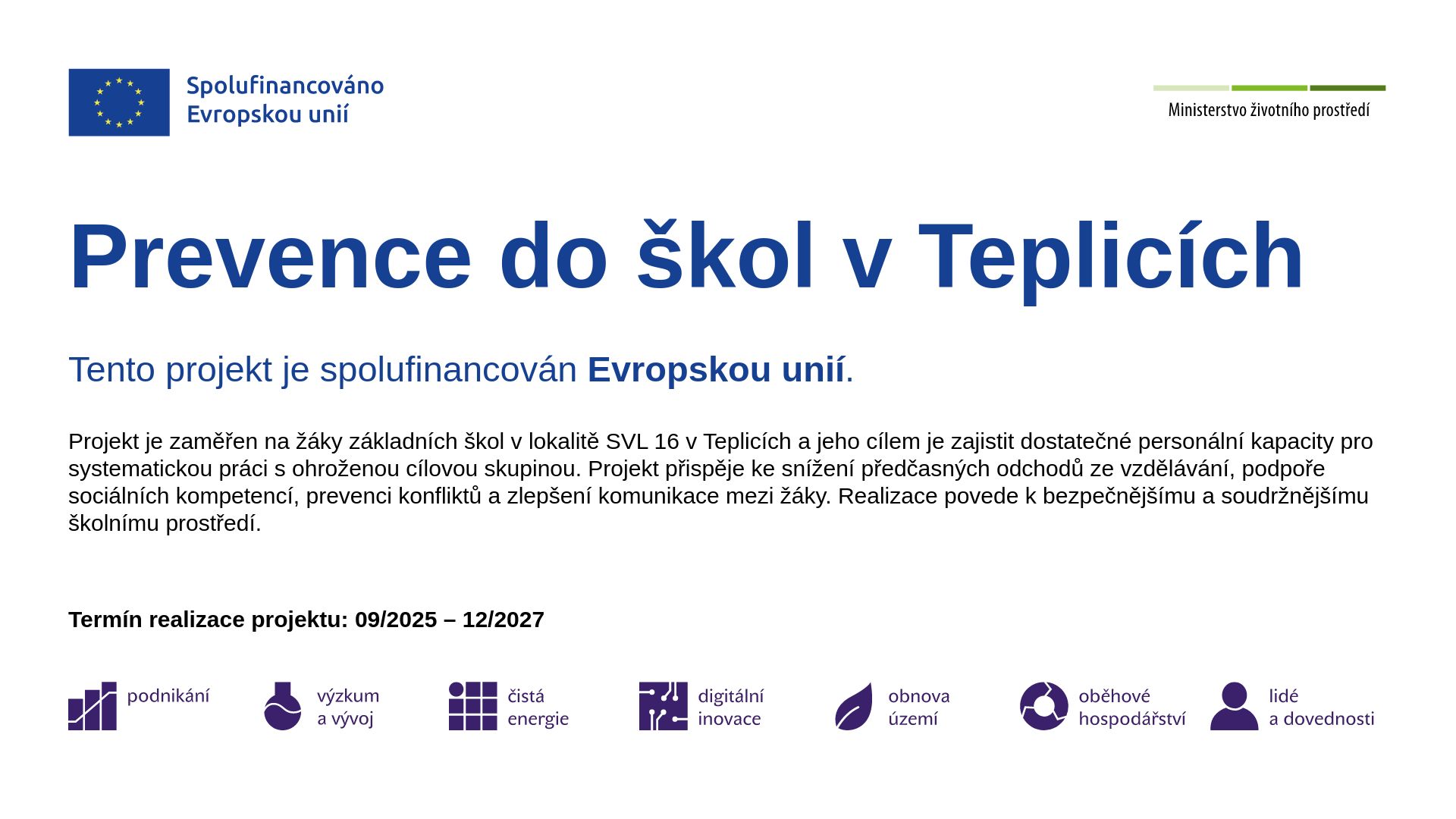 Projekt je zaměřen na žáky základních škol v lokalitě SVL 16 v Teplicích a jeho cílem je zajistit dostatečné personální kapacity pro systematickou práci s ohroženou cílovou skupinou.