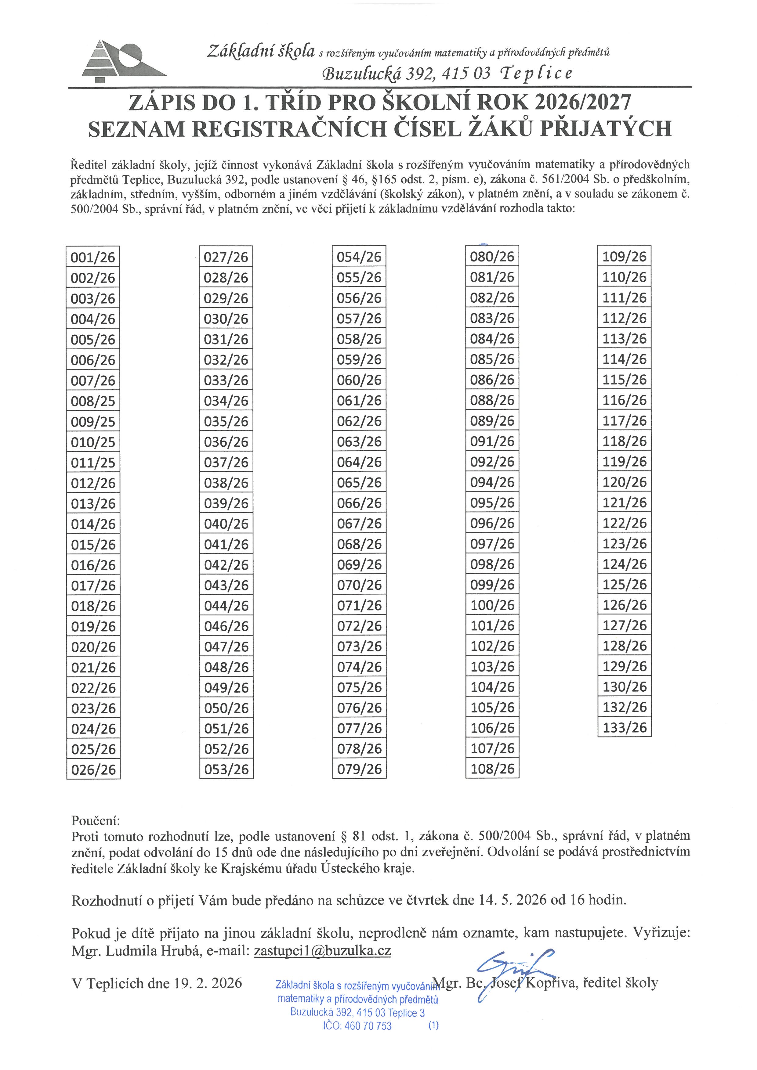 zveřejňujeme seznam registračních čísel žáků přijatých do 1. ročníku pro školní rok 2026/2027.